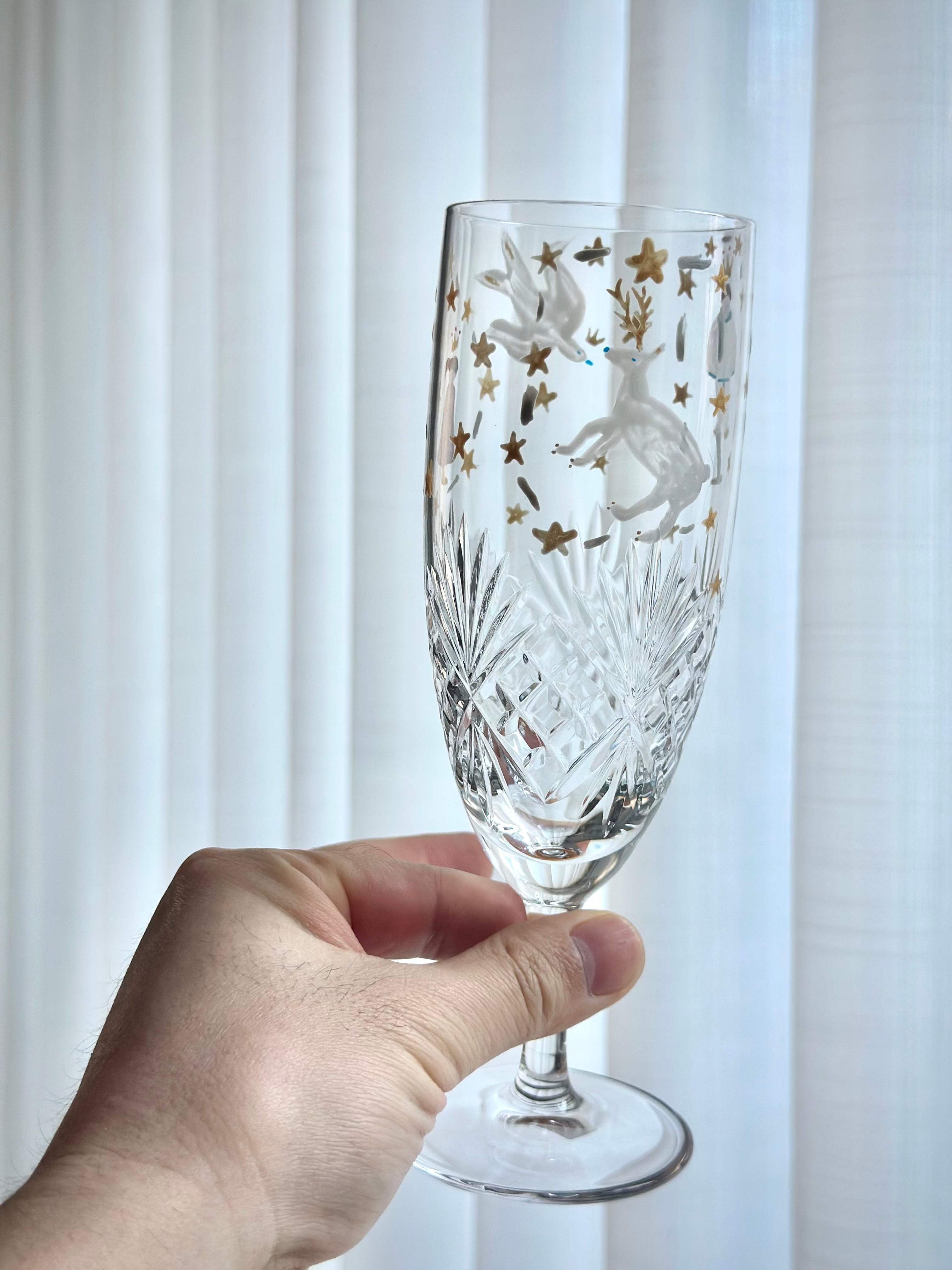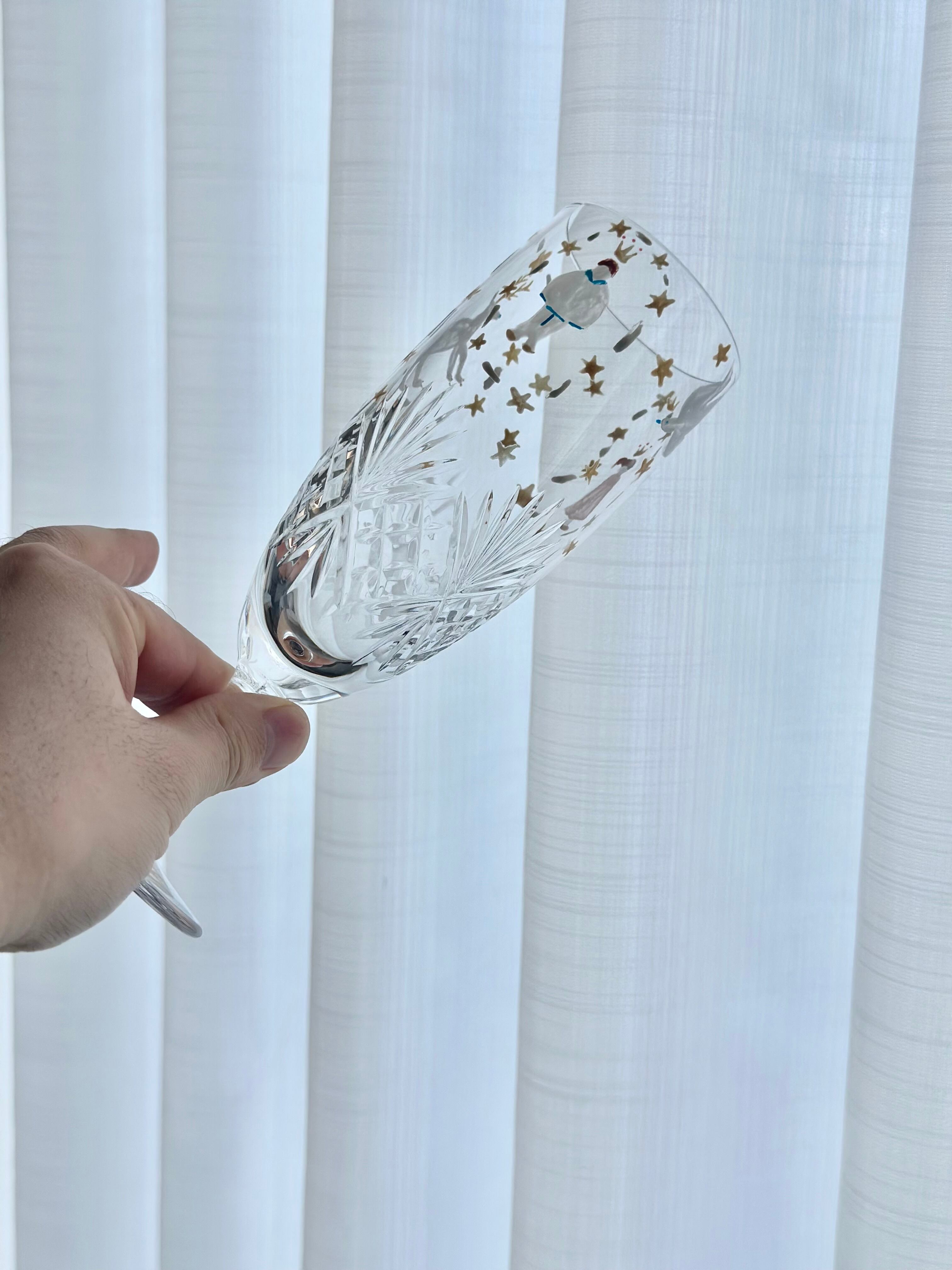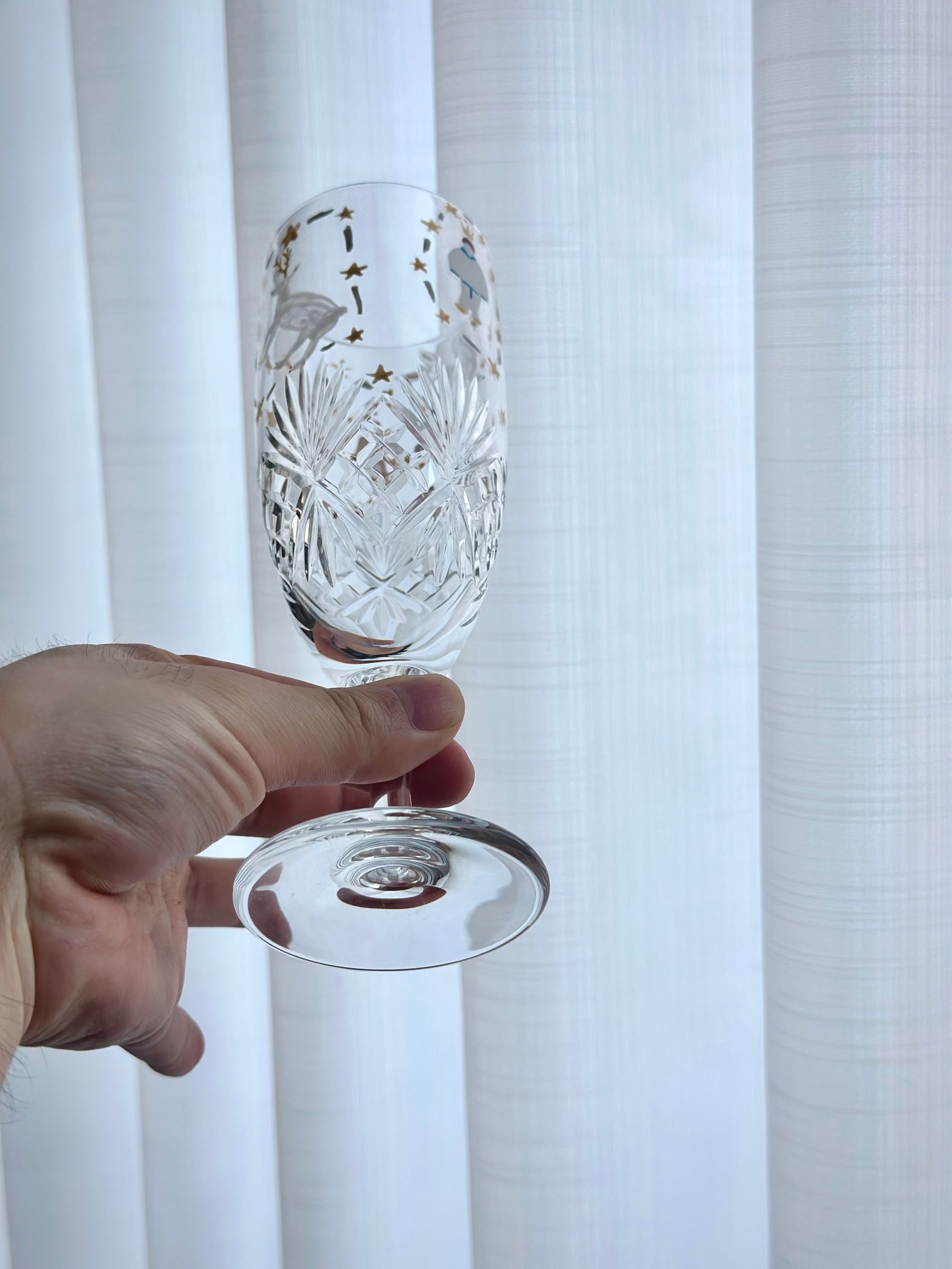 レトロなデザインのグラスに美しいモチーフが施されており、飲み物を注ぐと