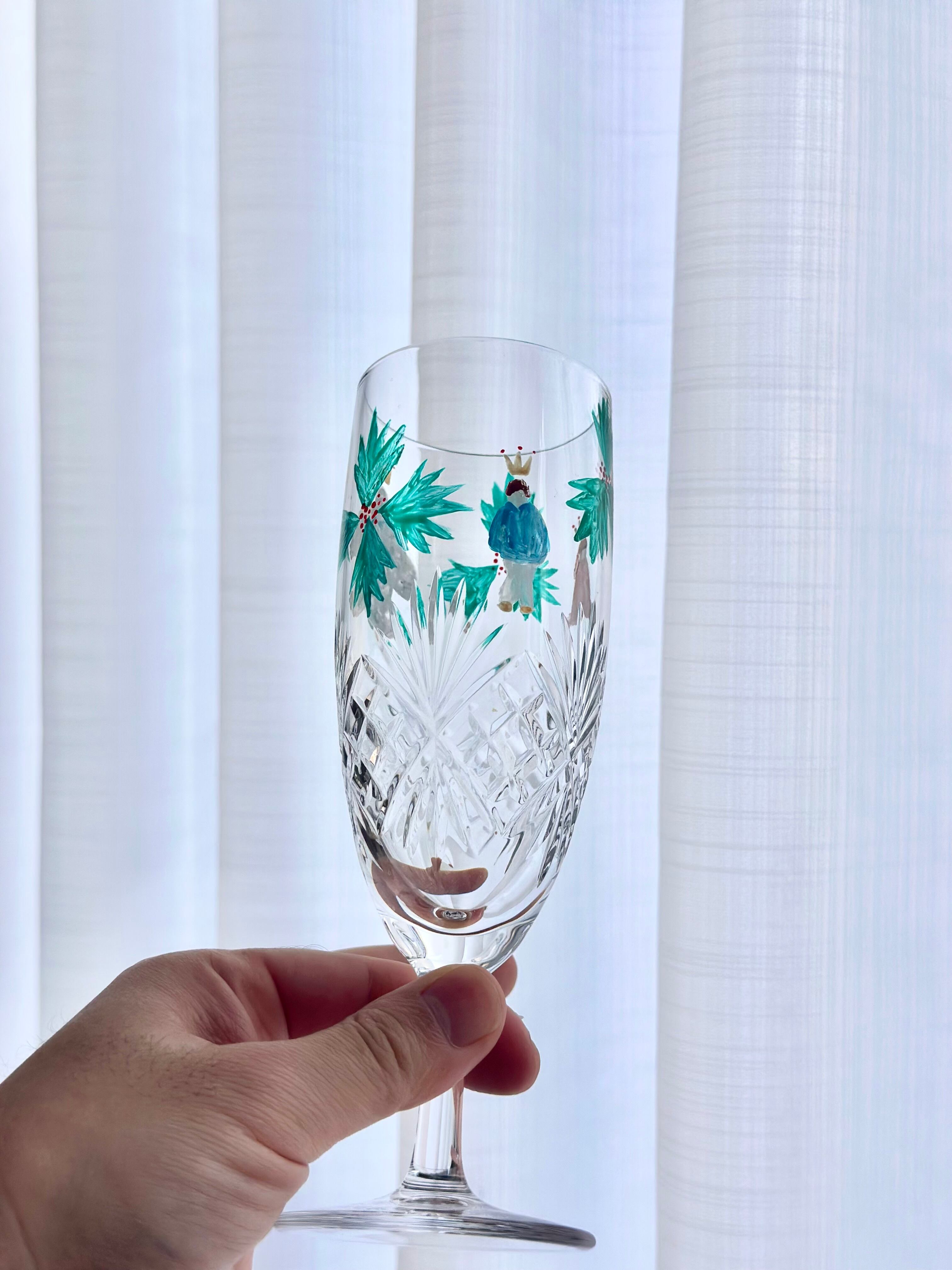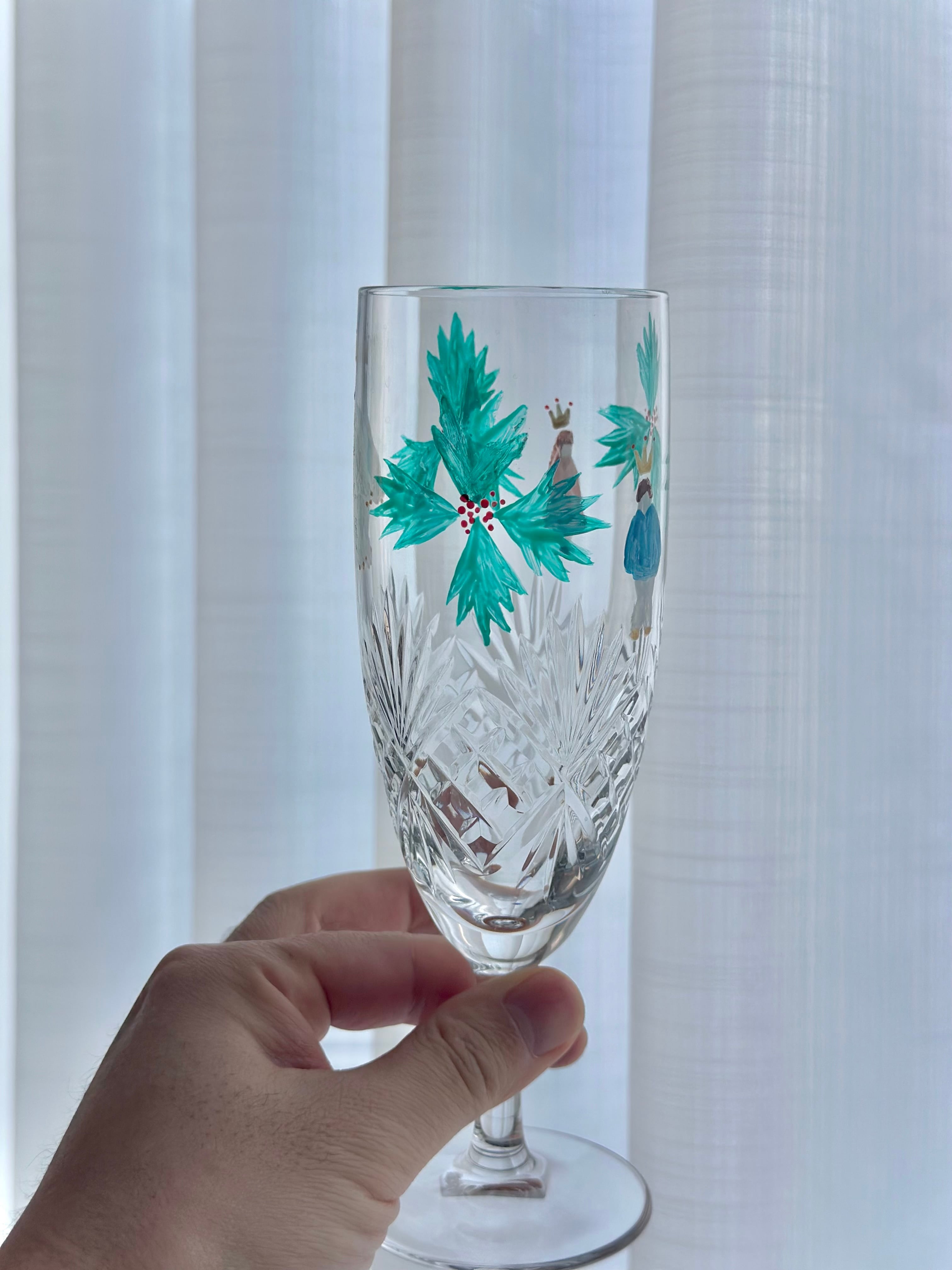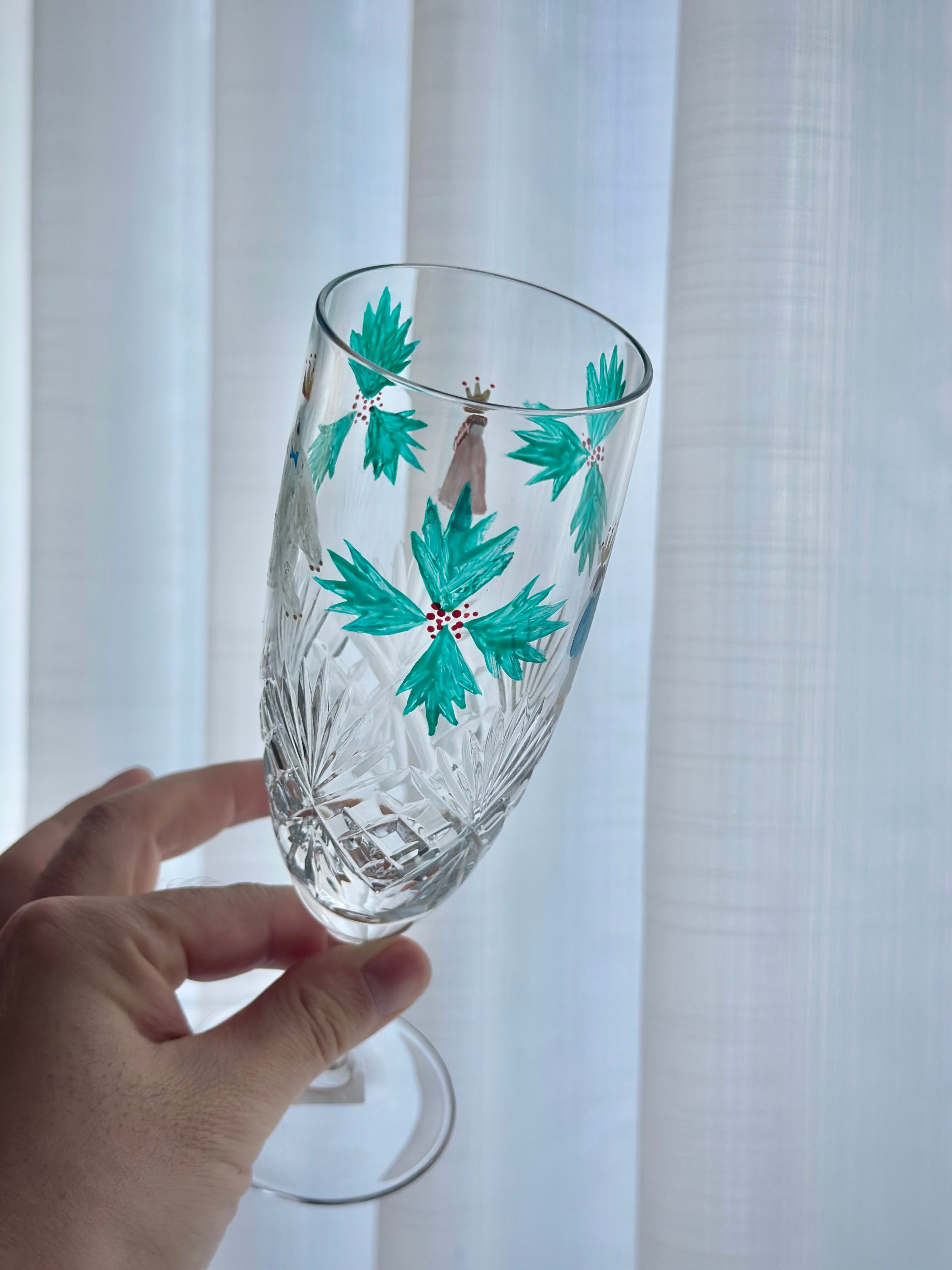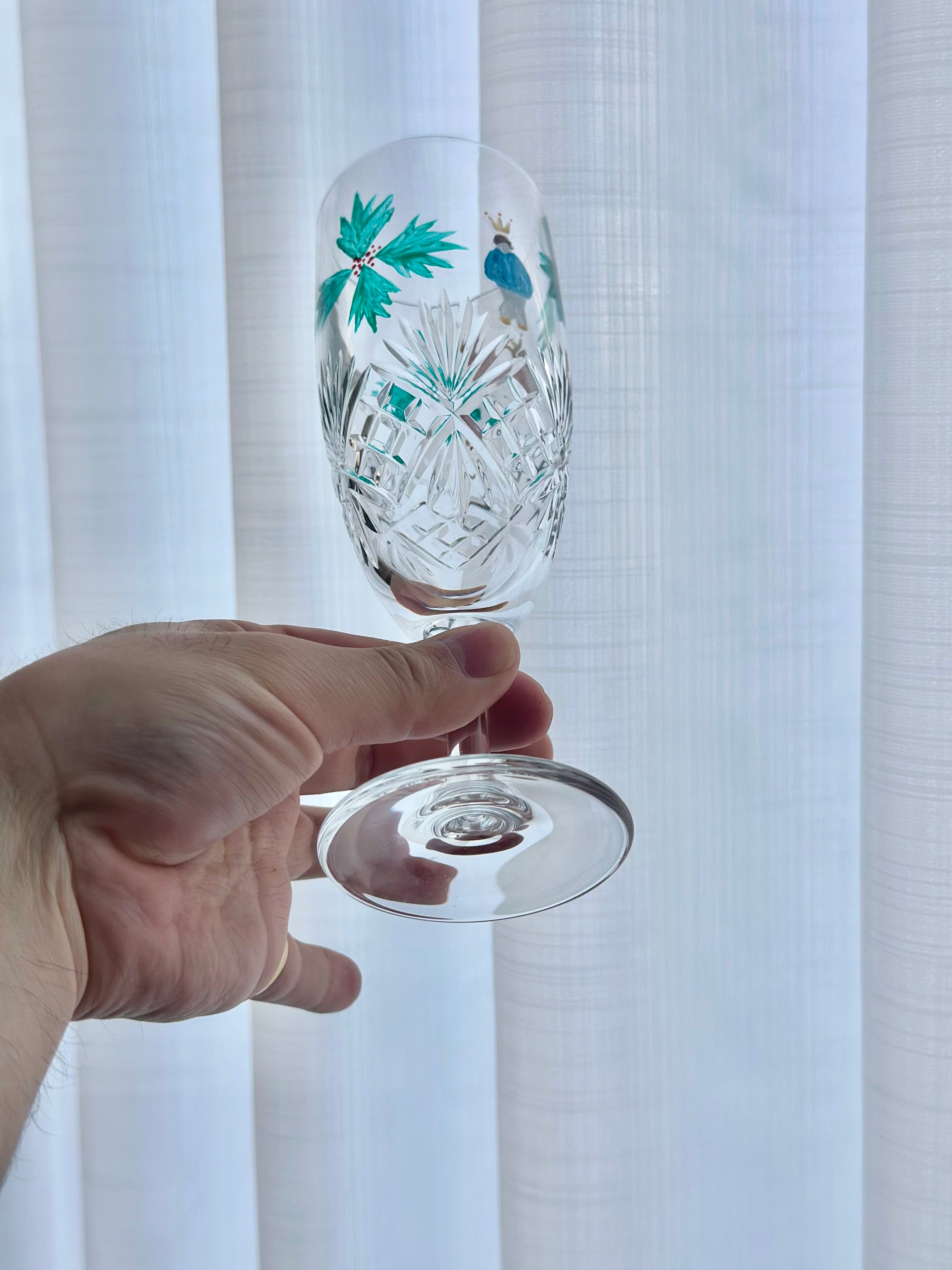 レトロなデザインのグラスに美しいモチーフが施されており、飲み物を注ぐと
